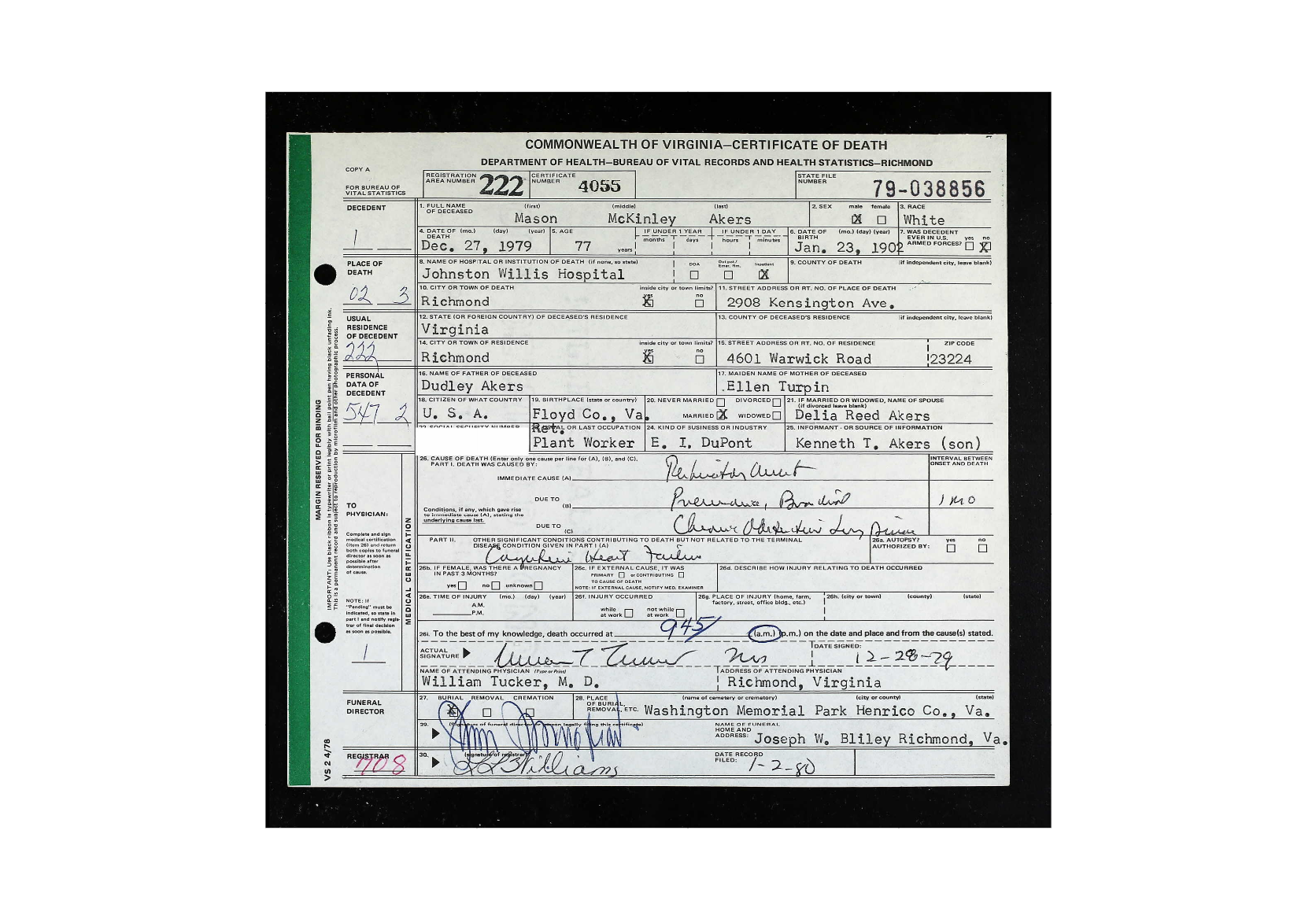 Richmond Times-Dispatch, Richmond, Virginia · Friday, December 28, 1979 1979 Burial: Washington Memorial Park, Sandston, Henrico Co., VA.