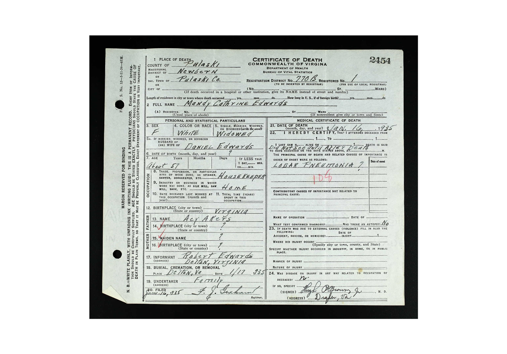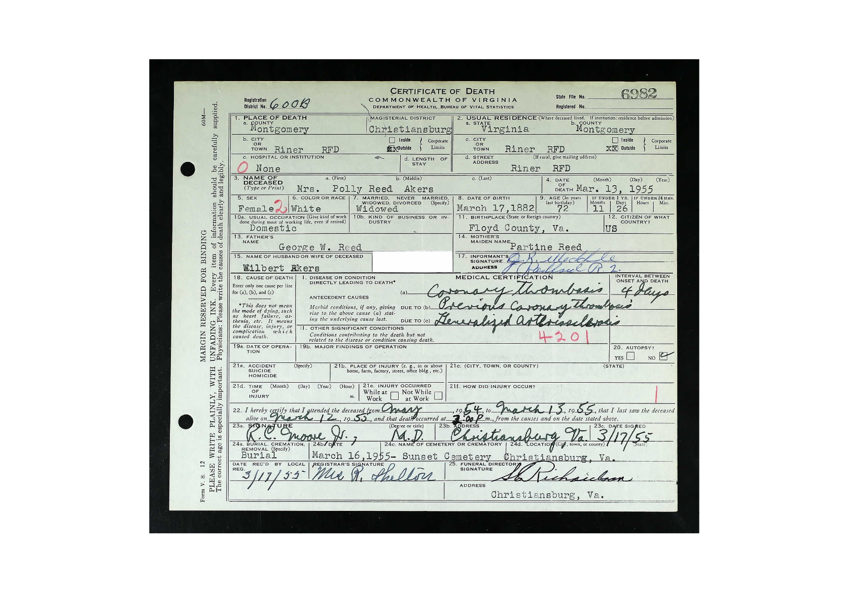 Akers, Woody 14 yo brother in law, b. VA, parents b. VA. 1918 Registration Card: Woodie Isaac Akers, 21 yo single w/m of Carthage, VA, b. May 30, 1897 Floyd Co., VA, nearest relative, Mary Jane Akers of Carthage, VA, his mark witnessed, medium height & build, blue eyes & brown hair, Registered in Hancock Co., IL. 1920: 1922 Marriage #1: Woodie I. Akers m. Toy N. Duncan 3-26-1922 Floyd Co., VA by Willie Dulaney, Minister of the Brethren Church. He 24 yo single w/m farmer, b. Floyd Co., VA, P.O. residence Alum Ridge, VA, s/o Wm C. & Mary J. Akers. She 23 yo single w/f, b. Floyd Co., VA, P.O. residence Carthage, VA, d/o Wm A. & Sabra Duncan. 1930 Residence: Radford City, VA, Melrose District, H374: Akers, Woody I. 32 yo w/m rayon compiler, b. VA, parents b. VA, 24 yo when married, rents, HOH. Toy M. 31 yo wife, b. VA, parents b. VA, 22 yo when married. Clarence W. 7 yo son, b. VA, parents b. VA, school. V. Gertrude 6 yo daughter, b. VA, parents b. VA, school. 1940 Residence: Floyd Co., VA, Indian Valley District 32-9, SR 751, H67: Akers, Woodie 42 yo w/m farm operator, b. VA, completed G5, resided in Roanoke, Roanoke Co., VA 1935, owns HOH. Toya N. 41 yo wife, b. VA, completed G7, resided in Roanoke, Roanoke Co., VA 1935, housework. Woodie C. 17 yo single son, b. VA, completed H3, resided in Roanoke, Roanoke Co., VA 1935, farm laborer. Virginia G. 16 yo daughter, b. VA, completed H2, resided in Roanoke, Roanoke Co., VA 1935, other work. Phyllis Jean 3 yo daughter, b. VA, completed G0. 1967 Death: 4-16-1967 of Floyd Co., VA. [Death Cert] 1967 Burial: Alley Cemetery, 413 Dulaney Rd NW, Floyd Co., VA. (no photo as of Mar 2026) |