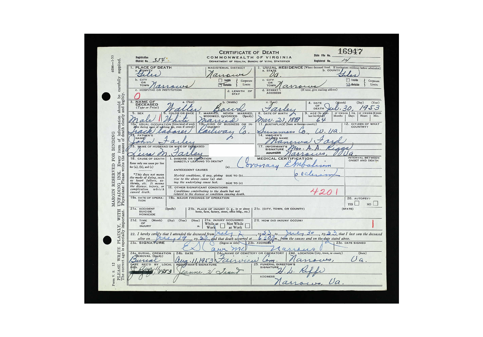 Parents: James Wallace & Arminta Alice Mintie (Flinchum) Akers. 1900 Birth: 3-1-1900 VA. 1910, 1920 Residence: Giles Co., VA with parents. 1923 Marriage #1: Anna Dora Johnson abt 1923. 1930 Residence: Ashe Co., NC, West Jefferson Town, College Ave, H44: Akers, Claude Sr 29 yo w/m works on steam railroad, b. VA, parents b. VA, 22 yo when married, HOH. Annie 26 yo wife, b. VA, parents b. VA, 19 yo when married. George W. 5 yo son, b. VA, parents b. VA. Claude Jr. 2 yo son, b. VA, parents b. VA. 1955 Death: 7-24-1955 Lewis-Gale Hospital, Roanoke City, VA but of Box 833 Radford, VA. Claude William Akers, 55 yo married w/m asst N. & W. R.R. foreman. Veteran: not asked. Spouse: Annie Akers. Father: Wallace Akers. Mother: Minnie Flinchum. Informant: hospital records. COD: ileus adynamic 4 days; partial intestinal obstruction 4 days; P.O. resection CA rectum 12 days; uremia secondary 48 hours. Burial: Radford Cemetery, Radford, VA, July 26, 1955. 1955 Burial: Sunrise Burial Park, Fairlawn, Pulaski Co., VA.