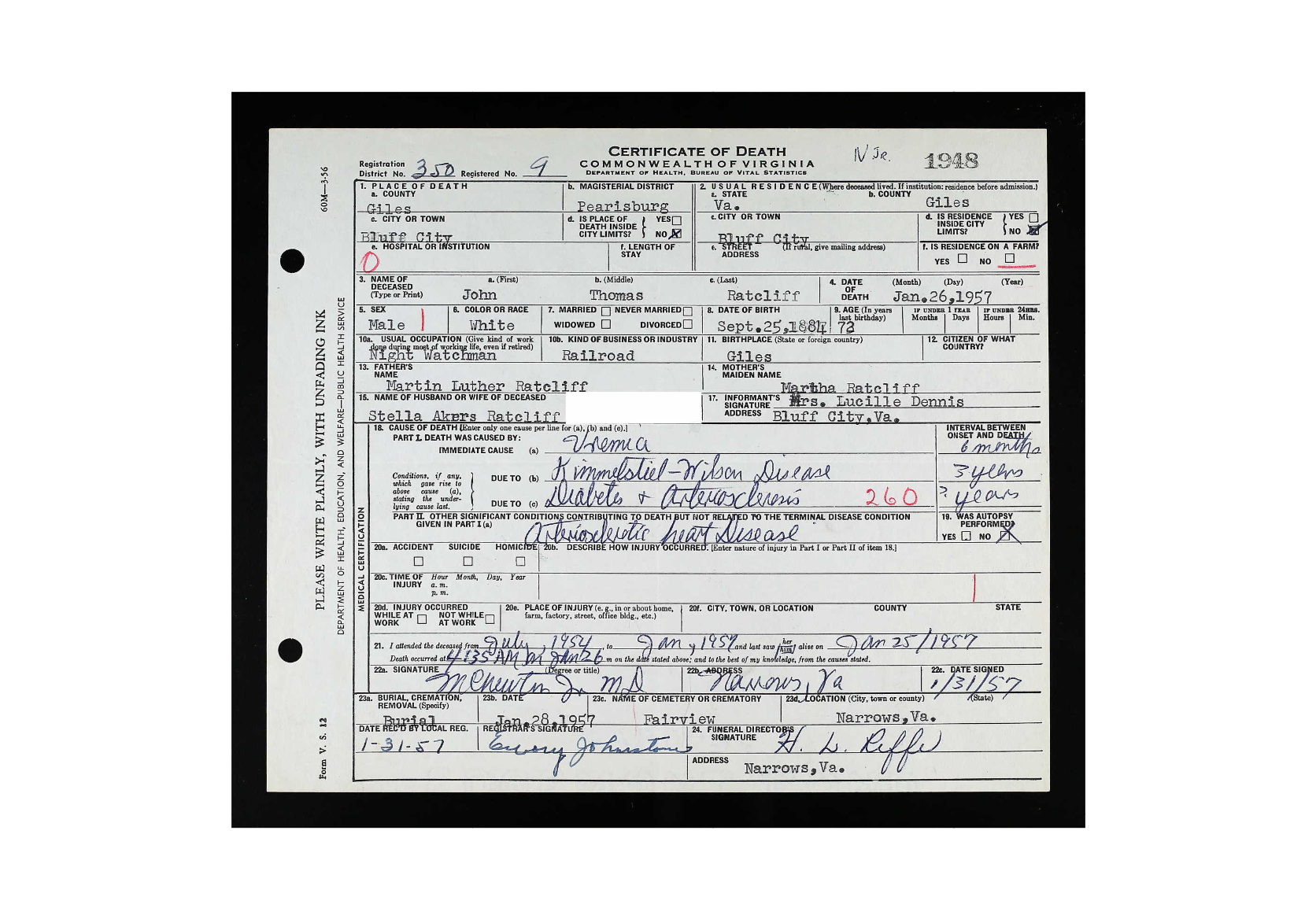 1884-1957, s/o Martin Luther & Martha Ann (Ratcliff) Ratcliff. [Death Cert] [no file] 1979 Death: 8-24-1879 Giles Memorial Hospital, Pearisburg, Giles Co., VA but of Rt #1, Box 62, Pearisburg, Giles Co., VA. [Death Cert] Stella Akers Ratcliff, 88 yo widowed w/f, b. Apr 28, 1891 VA. Spouse: John Thomas Ratcliff. Father: Wallace Akers. Mother: Minnie Flinchum. Informant: Mrs. Lucille A. Dennis. COD: cardio-pulmonary arrest immediate. Burial: Fairview Cemetery, Narrows, VA. No burial date. 1979 Burial: Fairview Cemetery, Narrows, Giles Co., VA.