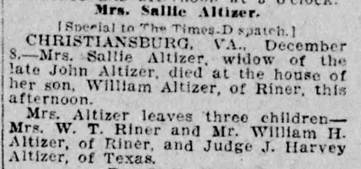 Altizer. She 19 yo single w/f, b. Montgomery Co., VA & living in Floyd
