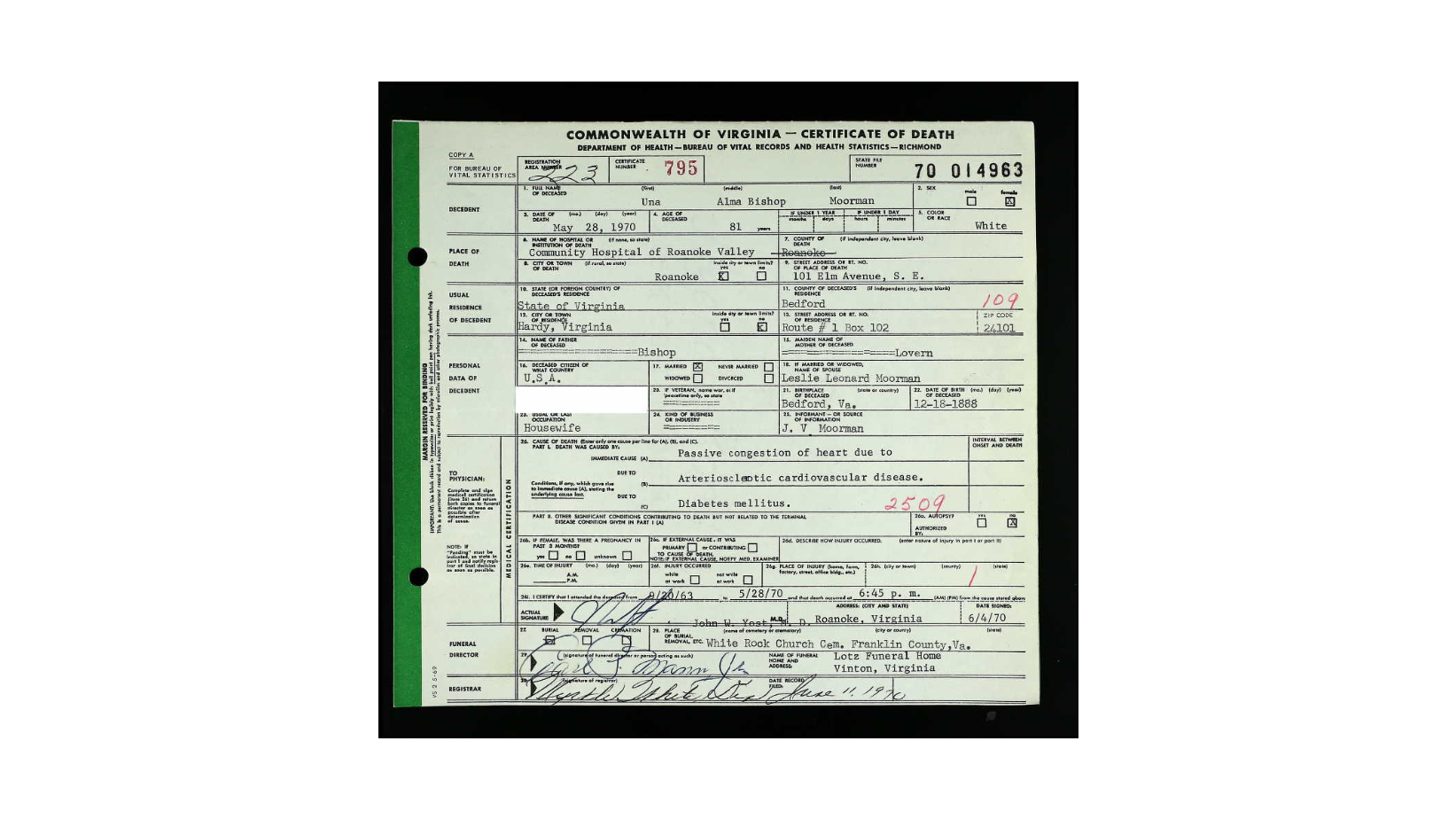5-28-1970 Roanoke but of Hardy, Bedford Co., VA. [Death Cert] 1970 Burial: