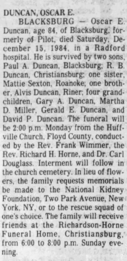Montgomery Co., VA with parents. 1938 Marriage #1: Alvis Duncan m. Merlie Chafin 2-14-1938 Floyd Co., VA. He 23 yo single w/m farmer, b. Floyd, residence Riner, Floyd Co., VA. Parents George Duncan & Susie Akers. She 23 yo single w/f, b. Floyd, residence Riner, Floyd Co., VA. Parents Obe Chafin & Alma Edwards. Merlie Vernon Chafin, 1914-2001, d/o Charles Obe & 1st wife Alma (Edwards) Chafin. [Chafin_John_Sarah] 1989 Death: 4-28-1989 Montgomery Regional Hospital, Blacksburg, VA, Residence Riner, Montgomery Co., VA. 1989 Burial: Sunset Cemetery, Christiansburg, Montgomery Co., VA. |