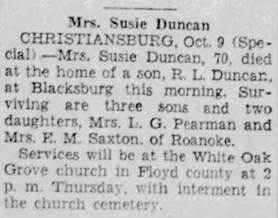 The Roanoke Times, Roanoke, Virginia · Thursday, October 10, 1946 1946 Burial: White Oak Grove Cemetery, White Oak