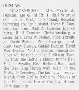 Parents: William Cyrus “Sarge” & Martha Elizabeth (Trail) Duncan 1909 Birth: 1909 VA. 1910, 1920 Residence: Montgomery Co., VA with