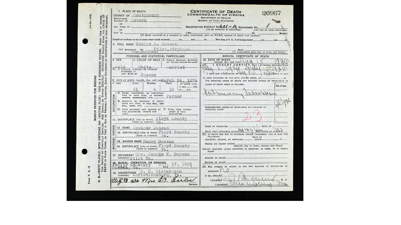 w/m farmer, b. Montgomery, residence Sowers, VA, s/o Geo Duncan & Susie