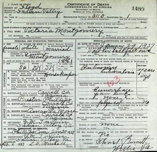 Parents: Ballard Preston & Amanda (Moore) Phillips. Ballard Preston Phillips, b. abt 1843 Carroll Co., VA, s/o Ambrose C. & Lucinda “Lucy” (Jennings) Phillips. Ambrose C. Phillips, 78 yo, d. 6-7-1894 Floyd Co., VA, b. Floyd Co., VA, s/o Tobias & Lucy. A Victoria B. Phillips ran the Vick P.O. May 12, 1900 until Dec 1904 but doubt same Victoria as this Victoria could not read or write. 1881 Birth: 1881 Carroll Co., VA. 1900, 1910 Residence: Floyd Co., VA with husband Landon Iredel “Lennie” Montgomery. 1920 Residence: Floyd Co., VA, Indian Valley District 96, H43: ...... Montgomery, Victoria 39 yo married w/f farmer, b. VA, parents b. VA, owns, cannot read or write, HOH. ............ Neoma 17 yo daughter, b. VA, parents b. VA, cannot write. ............ Eveline 15 yo daughter, b. VA, parents b. VA, school. ............ Jenny N. 10 yo daughter, b. VA, parents b. VA, school. ............ Lee 6 yo son, b. VA, parents b. VA. 1930 Residence: Floyd Co., VA, Indian Valley District 8, H4: ...... Montgomery, Victoria 48 yo w/f servant for a private family, b. VA, parents b. VA, 15 yo when 1st married, cannot read or write, owns, HOH. ............ Lee 17 yo son, b. VA, parents b. VA, cannot read or write, no occupation. 1937 Death: 1-29-1937 Indian Valley, Floyd Co., VA.