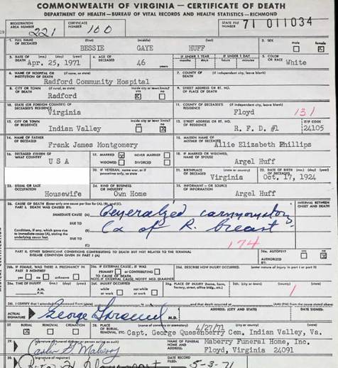 1971 Death: 4-25-1971 of R.F.D. #1, Indian Valley, Floyd Co., VA.