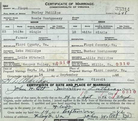 Parents: Frank James & Allie Elizabeth (Phillips) Montgomery. 1928 Birth: abt 1928 WVA. 1930 1940 Residence: Anawalt, McDowell Co., VA with parents. 1946 Marriage #1: Rosie Montgomery m. Burley Phillips 9-14-1946 Floyd Co., VA. Burley Clevo Phillips, 1923-1978, s/o Zebrum Fuget & Lola Jane (Mitchell) Phillips. [Phillips_Randolph_2wives]