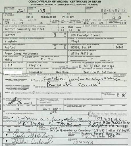 1993 Burial: Capt. George Quesenberry Cemetery, SR 754, Indian Valley, Floyd Co., VA. 1993 Obit: PHILLIPS, Rosie Montgomery, 66,