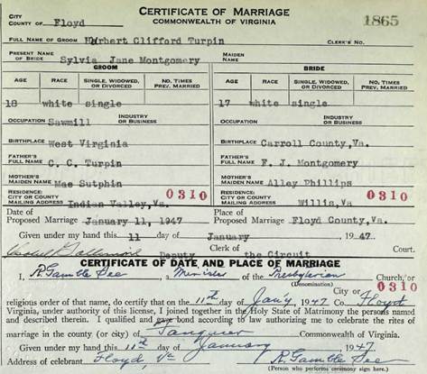 Parents: Frank James & Allie Elizabeth (Phillips) Montgomery. 1929 Birth: 10-1-1929 Carroll Co., VA. 1940 Residence: Anawalt, McDowell Co., VA with parents. 1947 Marriage #1: Sylvia Jane Montgomery m. Hubert Clifford Turpin 1-11-1947 Floyd Co., VA by R. Gamble See, Minister of the Presbyterian Church. He 18 yo single w/m, b. W. VA, residence Indian Valley, VA, s/o C. C. Turpin & Mae Sutphin. She 17 yo single w/f, b. Carroll Co., VA, residence Willis, VA, d/o F. J. Montgomery & Alley Phillips.