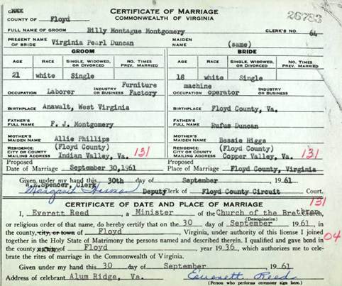 Parents: Frank James & Allie Elizabeth (Phillips) Montgomery. 1940 Birth: 6-13-1940 Anawalt, McDowell Co., VA. 1961 Marriage #1: Billy m. Virginia Pearl Duncan 9-30-1961 Floyd Co., VA. Virginia Pearl Duncan, d/o Rufus & Bessie (Higgs) Duncan. [Duncan_Thomas_Patsy]