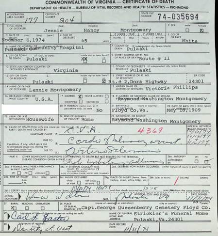 Parents: Frank James & Allie Elizabeth (Phillips) Montgomery. 1922 Birth: 9-22-1922 Floyd Co., VA. 1930 1940 Residence: Anawalt, McDowell Co., VA with parents. 1946 Marriage #1: Earnie Montgomery m. Clara Quesenberry 3-12-1946 Floyd Co., VA.
