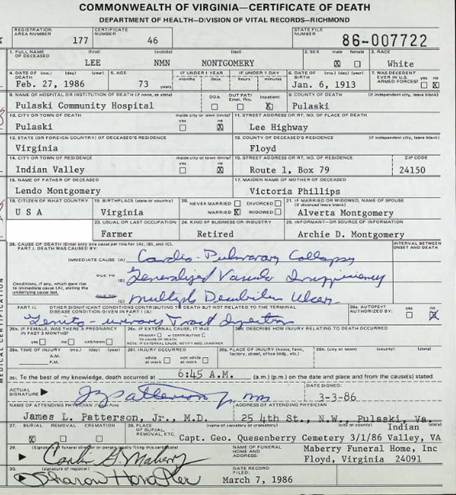 1940 Residence: Floyd Co., VA, Indian Valley District 32-10, SR 613, H157: ...... Montgomery, Lee 25 yo w/m farm operator, b. VA, completed G0, resided in same house 1935, owns, HOH. ............ Alverta 21 yo wife, b. VA, completed G5, resided in same house 1935, housework. ............ Lilly 4 yo daughter, b. VA, completed G0. ............ Junior 1 yo son, b. VA, completed G0. ............ Cazwell 80 yo widowed father, b. VA, completed G5, resided in same house 1935, unable to work. 1986 Death: 2-27-1986 of Rt 1 Indian Valley, Floyd Co., VA.
