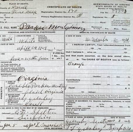 Parents: Caswell Parker “Babe” & Amanda "Mandy" (Quesenberry) Montgomery. 1909 Birth: 4-24-1909 VA. 1910 Residence: Floyd Co., VA with parents. 1914 Death: 11-2-1914 Pine Creek, Carroll Co., VA.