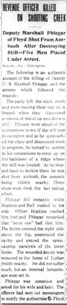 Floyd Co., VA, s/o C. M. & Della Phlegar. She 28 yo single w/f, b. Floyd