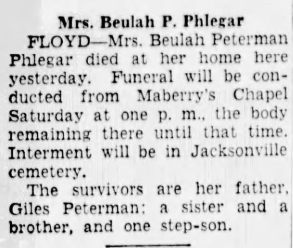 Burial of Beulah H. Peterman Phlegar: Jacksonville Cemetery, Floyd Co., VA.