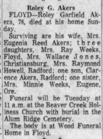 7-28-1956. 1956 Burial: Beaver Creek Cemetery, 409 Ridgeway Rd, Floyd Co., VA.