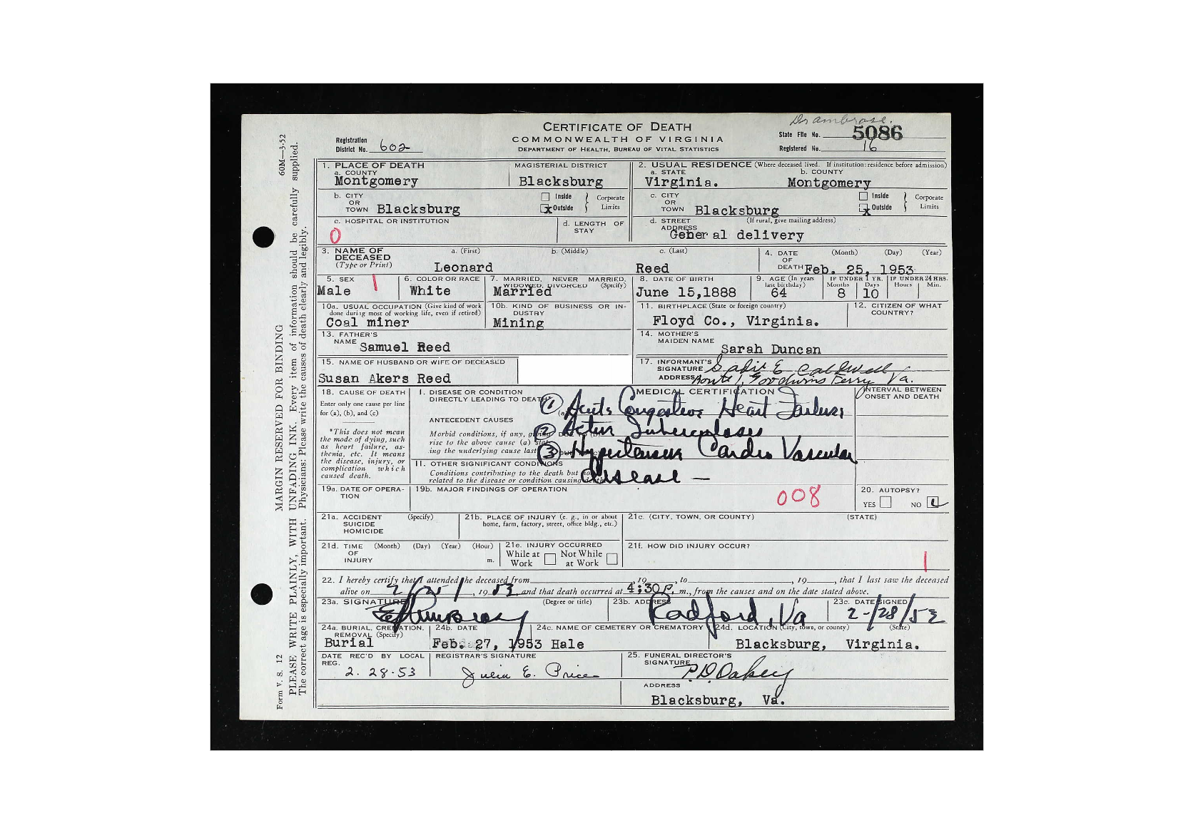 b. VA. 1921 Death: Sarra Reed, 86 yo widowed w/f, b. DOB blank, VA, Spouse: Harrison Reed. Father: Samuel Radford, b. VA. Mother: Ellen Radford, b. VA. Informant: Sam Radford of Indian Valley, VA. COD: abdominal tumor of doubtful nature that is it may have been malignant or non-malignant. Burial: family burial ground, Nov 18, 1921. Undertaker: C. M. Graham of Floyd, VA. 1921 Burial: She may be buried same cemetery as Harrison but only Sarah F. Reed_Wife of Harrison D. Reed DOB of 1865 is on stone & if same person then this is an incorrect DOB. |