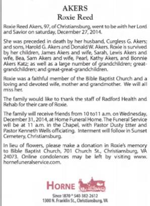 Parents: Amos & 2nd wife Sarah Susan (Reed) Reed. 1915 Birth: 9-12-1915 VA. 1920 Residence: Floyd Co., VA with parents. 1930 Residence: Floyd Co., VA with widowed mother as HOH. 1940 Residence: Montgomery Co., VA, Auburn District 61-6, SR 669 & 670, H45: Reed, Amos J. 23 yo w/m farm laborer, b. VA, completed G2, resided in Montgomery Co., VA 1935, rents, HOH. Roxie M. 23 yo wife, b. VA, completed G7, resided in Montgomery Co., VA 1935, housework. Alfred A. 0/12 yo daughter, b. VA, completed G0. 1957 Death: 6-21-1957. 1957 Burial: Altizer Family Cemetery, Montgomery Co., VA.