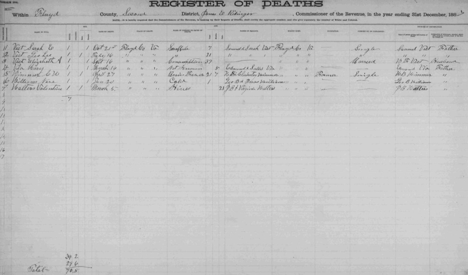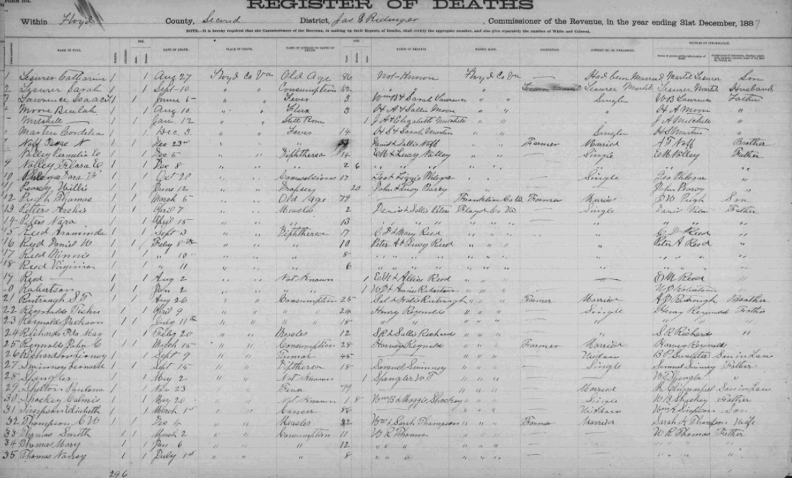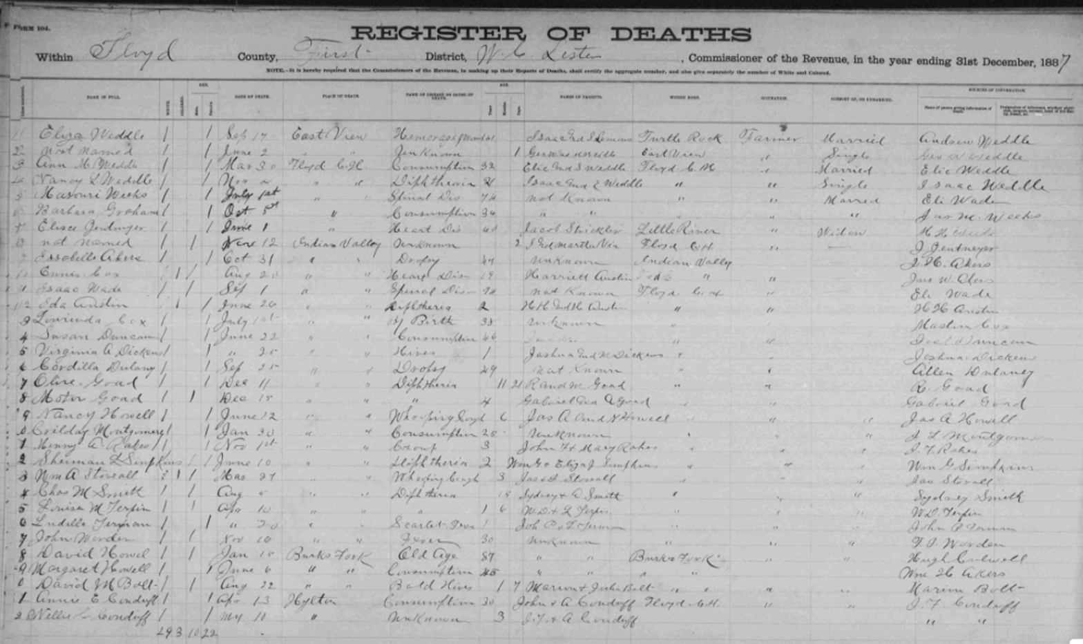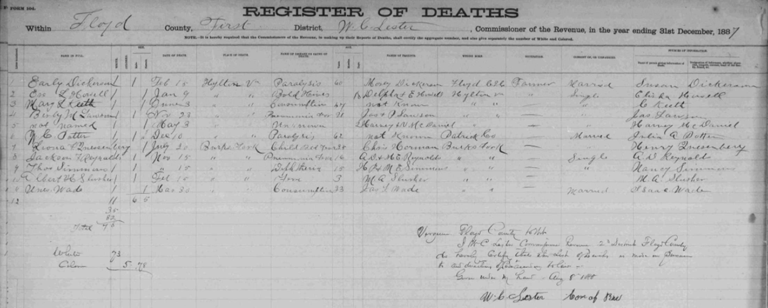 1887 Floyd County, Virginia Death Register