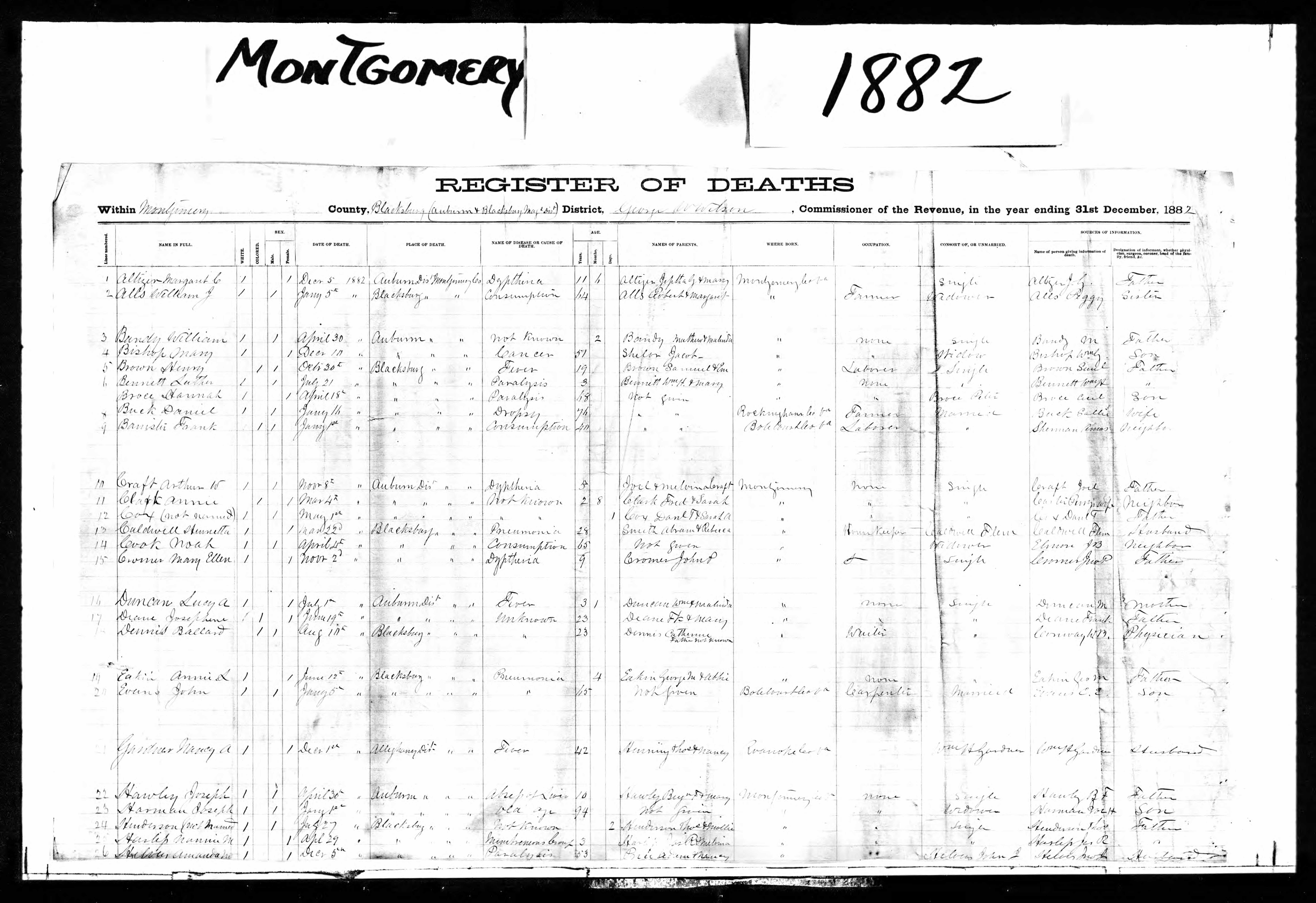 Susan All per Montgomery Co., VA death register. Parents Jobe H. &