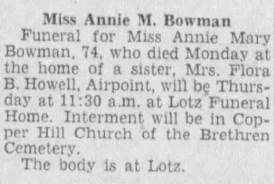 Flora Belle Bowman, d/o Benjamin & Julia Frances (Henry) Bowman.