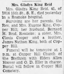 Gladys Ellen King, d/o Eugene O. & Delia A. (Mills) King. [Death Cert] [King_Henry_Sarah]