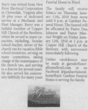 follow in the Copper Hill Church of the Brethren Cemetery. The family will