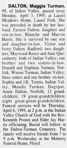 Dalton, d/o Arnold Bruce & Lillie Anna (Turman) Dalton. [Death Cert] [obit not