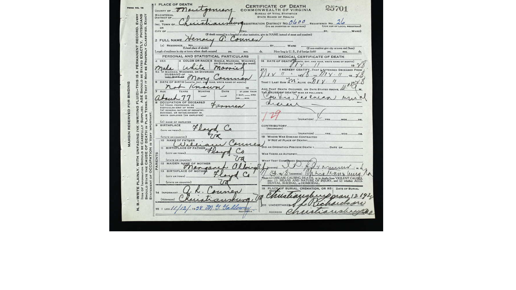 Floyd Co., VA Death Register pg 2] looks like age 20 years but I don’t