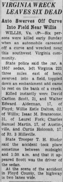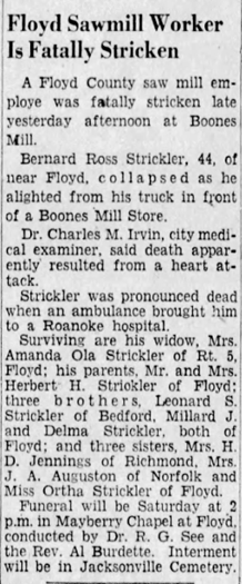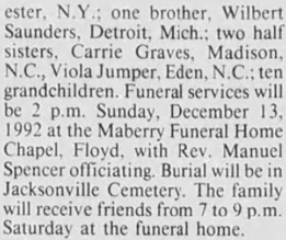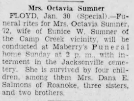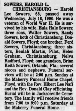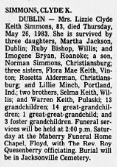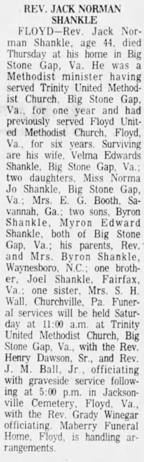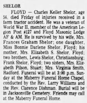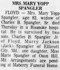Rose, Clayton, Delaware; sister-in-law, Virginia Rose, Abbs Valley, Va.;