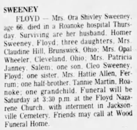 She is survived by her husband, Elwood Sweeney; son & daughter-in-law,