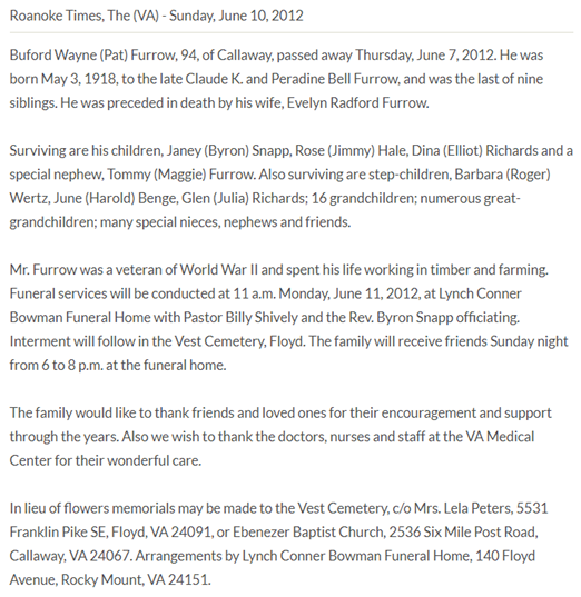 and Evelyn Radford Furrow. In addition to her parents, she was preceded in