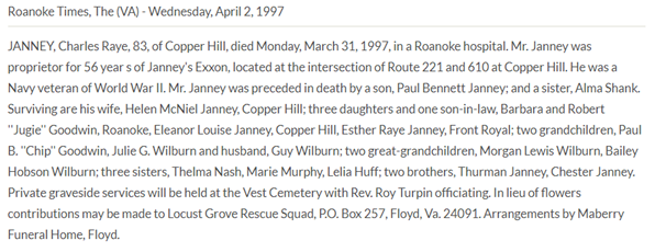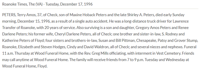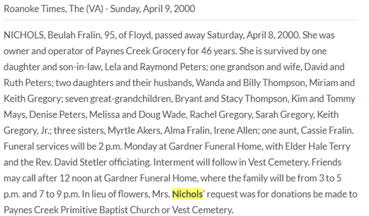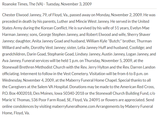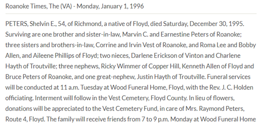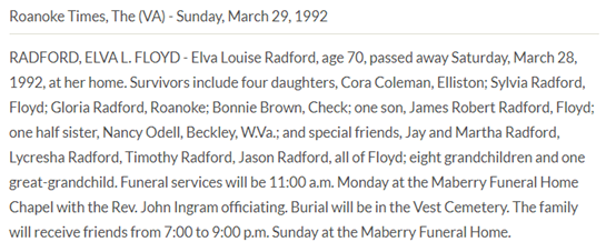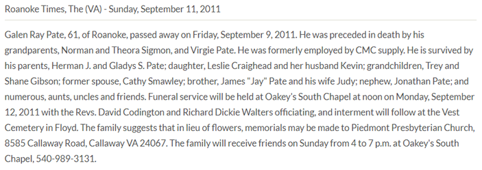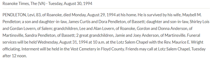 Burial will be held at 2PM at Vest Cemetery in Check, VA. The family will
