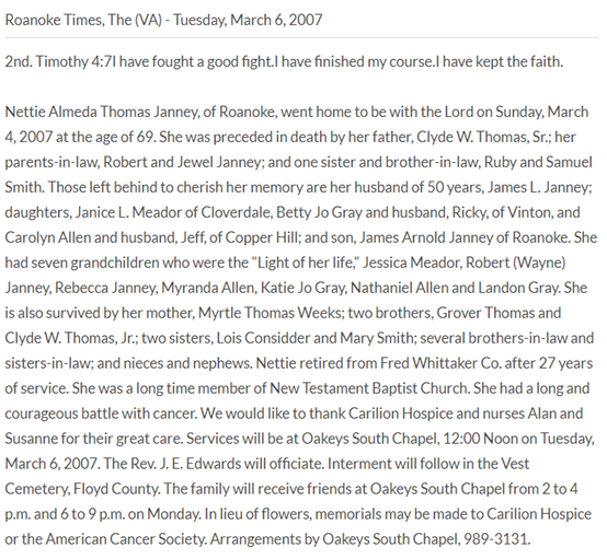 Franklin Co., VA, d/o Samuel L. & Delilah Ellen (Smith) Robertson. [Death Cert] [no