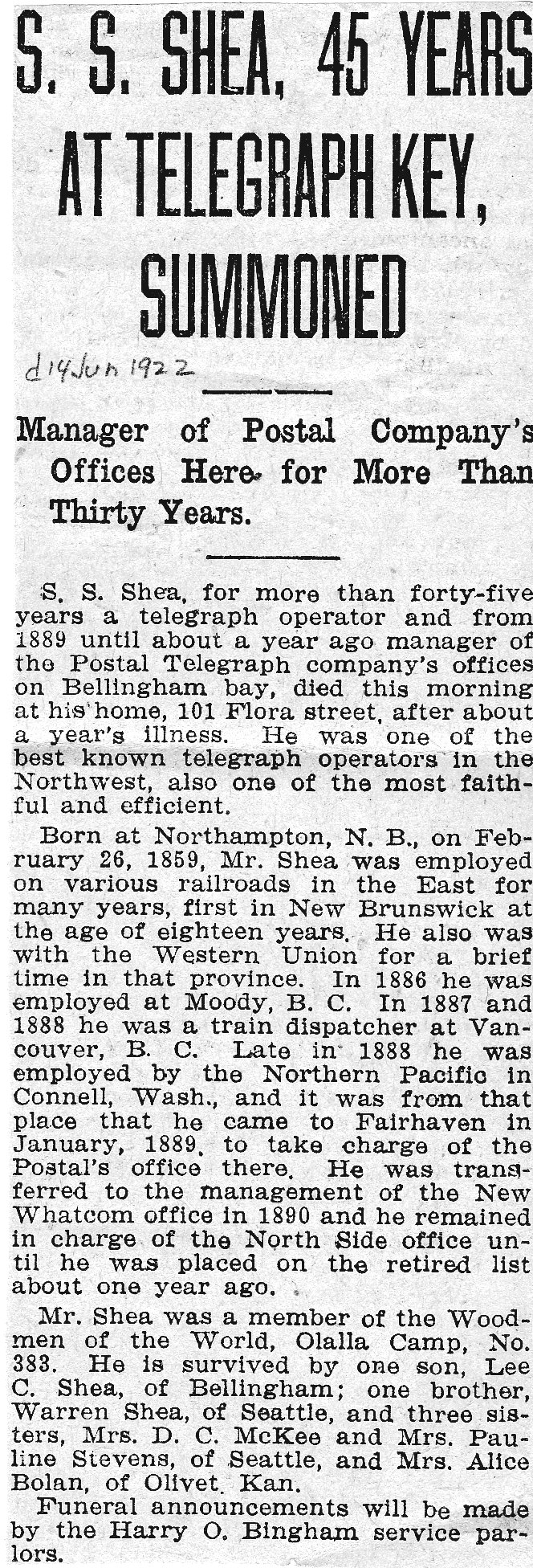 S. S. SHEA, 45 YEARS AT TELEGRAPH KEY, SUMMONEDManager of Postal Company's Offices Here for More Than Thirty Years.S. S. Shea, for more than forty-five years a telegraph operator and from 1889 until about a year ago manager of the Postal Telegraph company's offices on Bellingham bay, died this morning at his home, 101 Flora street, after about a year's illness. He was one of the best known telegraph operators in the Northwest, also one of the most faithful and efficient. Born at Northampton, N.B., on February 26, 1859, Mr. Shea was employed on various railroads in the East for many years, first in New Brunswick at the age of eighteen years. He also was with the Western Union for a brief time in that province. In 1886 he was employed at Moody, B. C. In 1887 and 1888 he was a train dispatcher at Vancouver, B. C. Late in 1888 he was employed by the Northern Pacific in Connell, Wash., and it was from that place that he came to Fairhaven in January, 1889, to take charge of the Postal's office there. He was transferred to the management of the New Whatcom office 1890 and he remained in charge of the North Side office until he was placed on the retired list about one year ago. Mr. Shea was a member of the Woodmen of the World, Olalla Camp, No. 383. He is survived by one son, Lee C. Shea, of Bellingham; one brother, Warren Shea, of Seattle, and three sisters, Mrs. D. C. McKee and Mrs. Pauline Stevens, of Seattle, and Mrs. Alice Bolan, of Olivet, Kan. Funeral announcements will be made by the Harry O. Bingham service parlors.