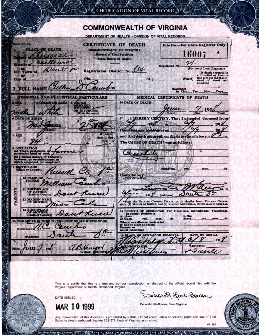 Death Certificate of Cullen D. Combs