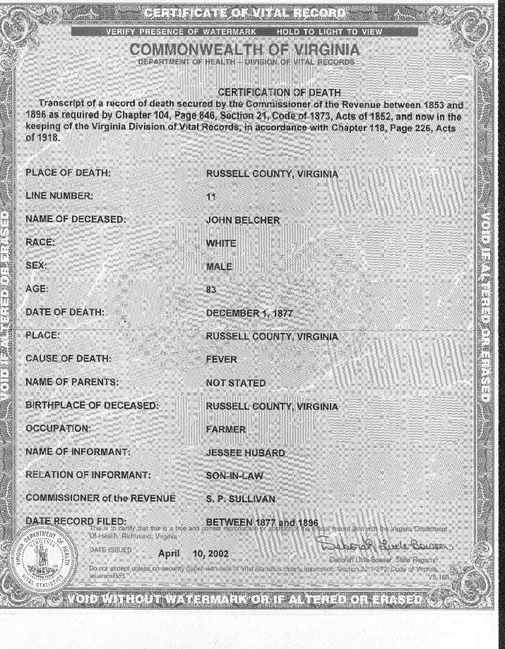 Death Certificate of John Belcher