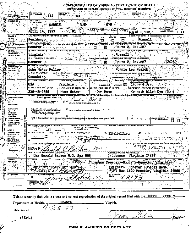 Death Certificate of Nannie Ruth "Fuller" Dye