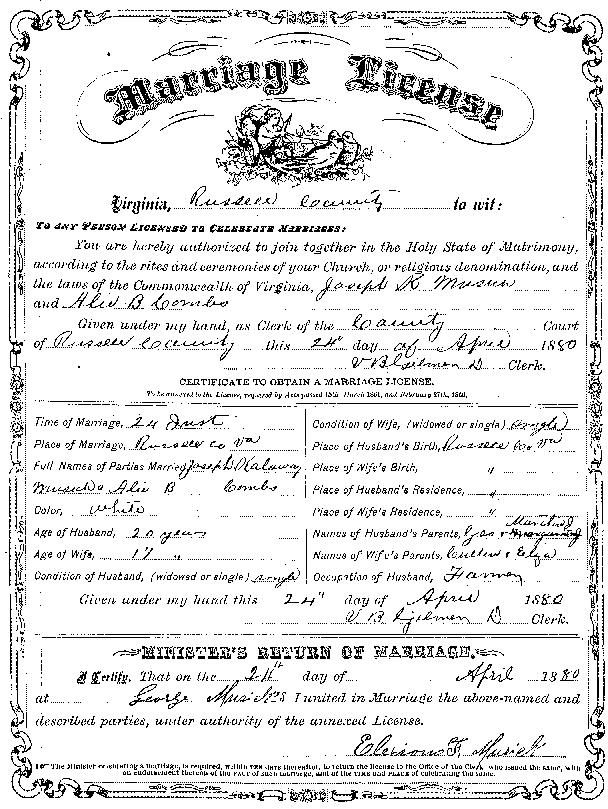 Marriage License of Joseph K. Musick & Allie B. Combs
