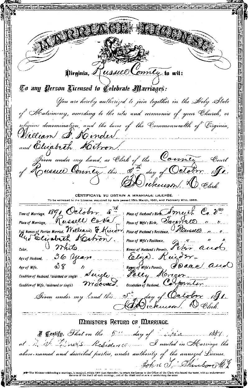 Marriage License of William F. Kinder & Elizabeth "Kreger" Ketron