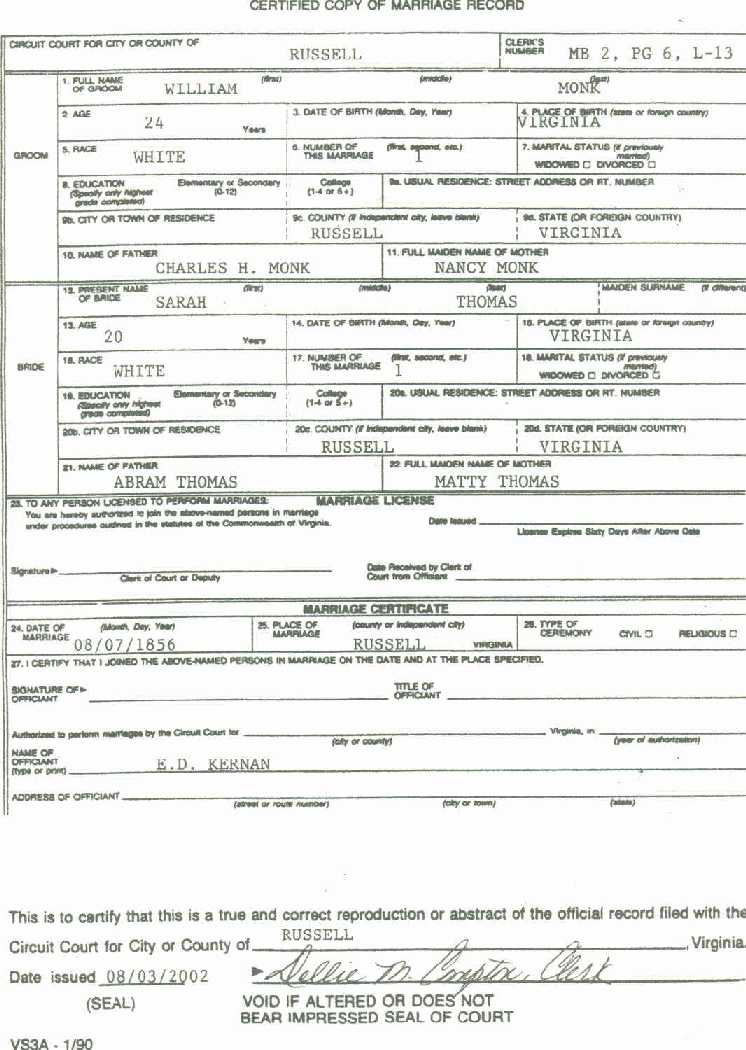 Marriage License of William Monk & Sarah Thomas