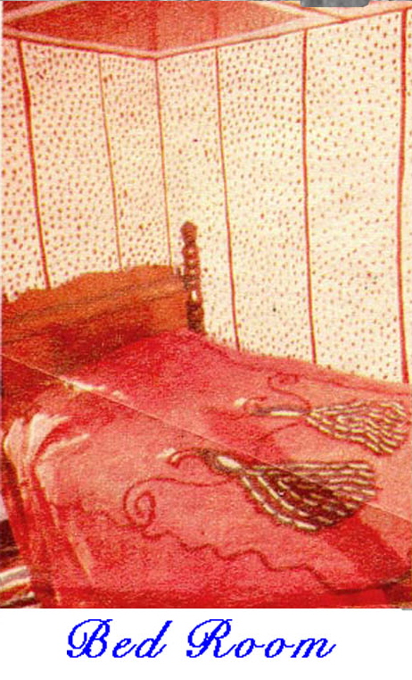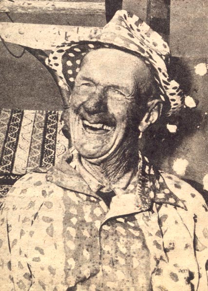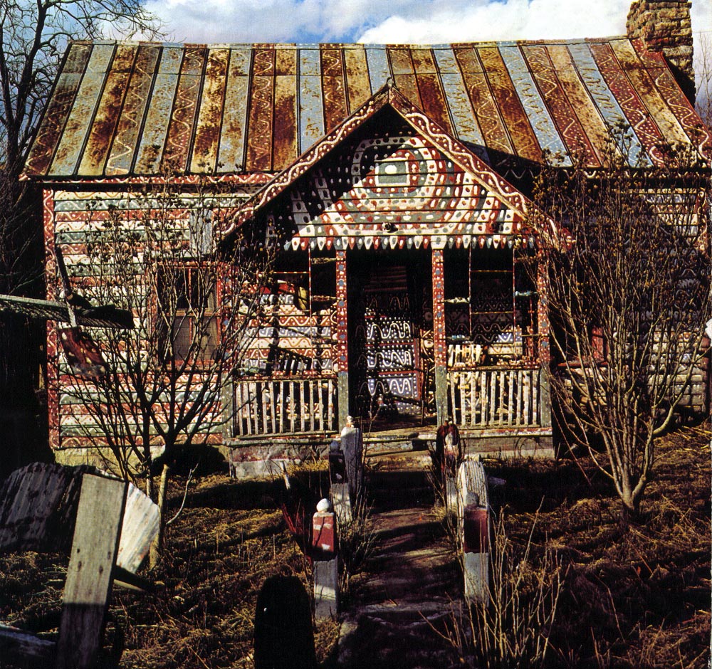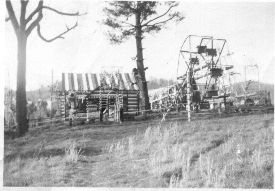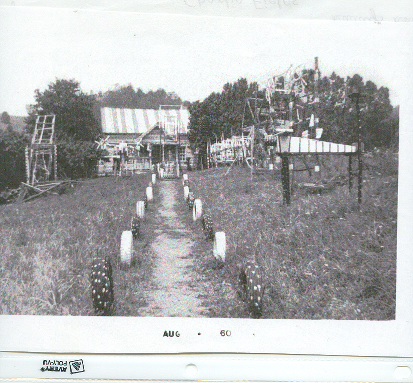 We went to the Ferguson/Fields reunion and stopped to visited Charlie around 1950 and took this photo of his house in black and white (Note: Both Chris & Susan sent copies of the second black & white photo of the house). I have one in color after the house is deteriorating and about gone, but I wanted to send the one which showed the ferris wheel and things outside. He greeted us at the swinging bridge in his polka-dotted clothes and shoes and took us inside the house and showed us around. He had beehives outside and had drilled holes so the bees could come inside, where he had them covered with glass, and he could watch them at work. He told us he never took the honey because they worked too hard to make it. Soon after his mother died was when he began painting the house in mostly red, white and blue with polka-dotted designs. He painted the tin roof, the window frames and the chimney. Inside he painted the walls, floors, ceilings, doors. There were bright stripes and squiggles and wavy lines and squares filled with mostly polka-dotted designs. He truly was an "American Folk Artist". You wouldn't understand unless you had seen the house inside and outside. If anyone has other photo's would love to have copies, also of the rest of the family.
