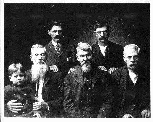 Pictured are, top row, left to right: Beverly Thompson "Bev" Combs b. abt 1858, d. 1935, Fielding W. "Feeb" Combs b. 08 Aug 1867, d. 15 Mar 1918. Bottom row: the child is probably John Bourd Combs, born 1891, sitting on the lap of his father William D. Combs b. 20 Nov 1840, d. 27 Feb 1934, Frederick J. "Fed" Combs b. abt 1847, d. 1907, who lived in Kentucky all his life after the Civil War and John Million Combs b. abt 1851, d. 25 Dec 1918, who was always called Million. The photo, according to James Combs of Roane County, WVA, was taken about 1895. Not pictured is Thomas H. Combs b. abt. 1854 d. abt 1890.