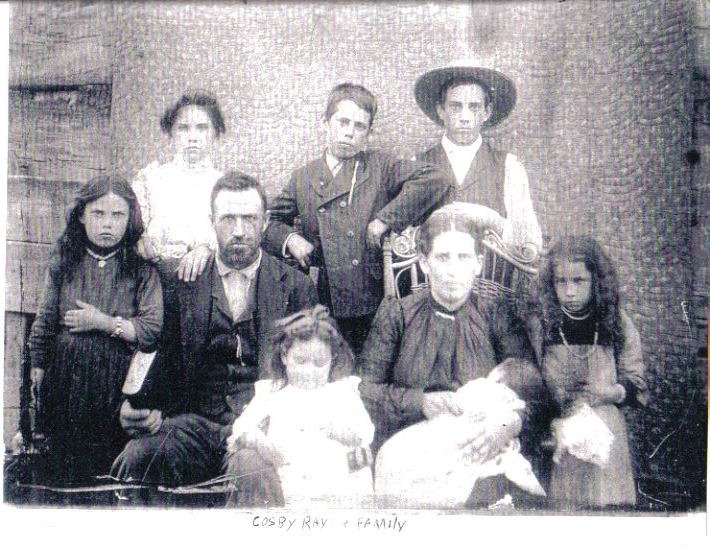 Elias Ray was born abt. 1861 in Russell Co., VA, the s/o Elias Ray & Cynthia Honaker. Elias' father was killed in action at the battle of Kernstown on 23 Mar 1862 and his mother re-married to Henderson Dye. On 27 Feb 1883, in Russell Co., Elias married Cosby Jane Ray, d/o Shadrack W. "Shade" Ray & Delilah Hubbard. Cosby was born abt. 1868 in Russell Co. Elias and Cosby had fourteen children. The dates of their deaths are not known at this time. Thye are buried in the Honaker - Ray family cemetery near the junction of Lewis Creek and the Clinch River, south of Honaker in unmarked graves. This photo was probably taken about 1899 or 1900 and it's believed that the persons depicted are as follows: Back Row: Alafair Ray, Shade Ray, Jonas Ray. Front Row: Minnie Ray, Elias Ray, Nannie Elizabeth Ray, Cosby Ray, holding Rachel Ray and Delilah Ray.