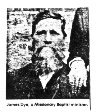 James Dye was born about 1839 in Russell Co., Virginia, the son of John Dye and Nancy Little. On 06 Sep 1860 he married his first cousin, Nancy Dye, the daughter of Pryor Dye, Sr. and Carlotta Carter. James and Nancy had eight children: 1) Polly b: 15 Sep 1861; 2) Sarah E. b: abt 1862, married 1st James Charlie McNulty, 2nd Samuel Reedy and third a Pruitt; 3) Mariah F. b: 15 Mar 1866, married Henry Miller; 4) Caroline b: 21 Oct 1867, married John Cox; 5) Mary Alice b: 27 Dec 1868, married Elihue Dye, son of Pryor Dye, Jr. and Sarah Williams; 6) Rebecca b: 22 Sep 1871, married 1st her uncle William Dye, son of Pryor Dye, Sr. and Carlotta Carter and 2nd William H. Musick; 7) Priscilla b: 01 May 1873; and 8) Nancy Catherine b: 22 Nov 1874, married William H. Reedy, son of Samuel Reedy, above, and Elizabeth Clear. James Dye died 04 Feb 1919 and was buried in the James Dye family cemetery.