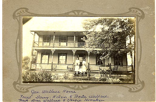 This is a picture of a home in Honaker. It is the Home of James Wallace. Pictured in the front is Daisy, Helen and Berta Wallace. In the back is Dora Wallace and Vergie Honaker. The photo is believed to have been taken in the 1890's.
