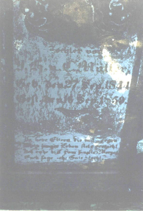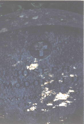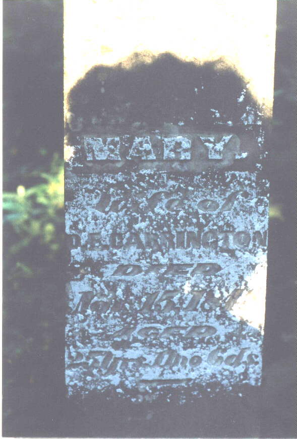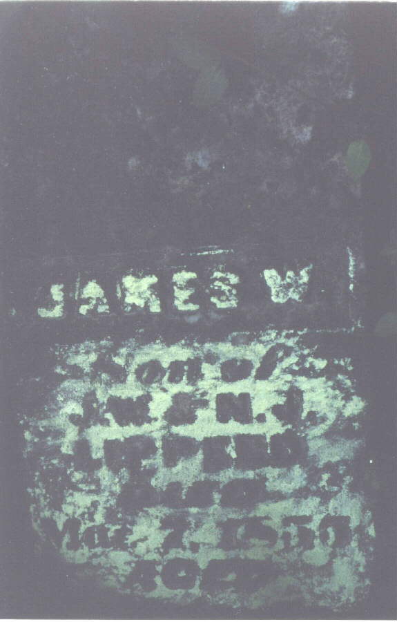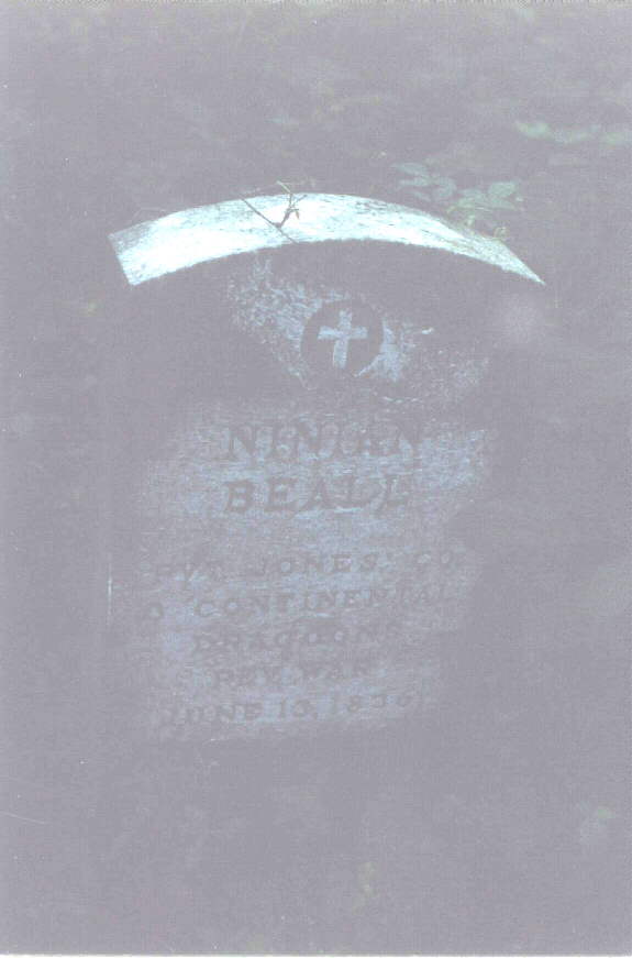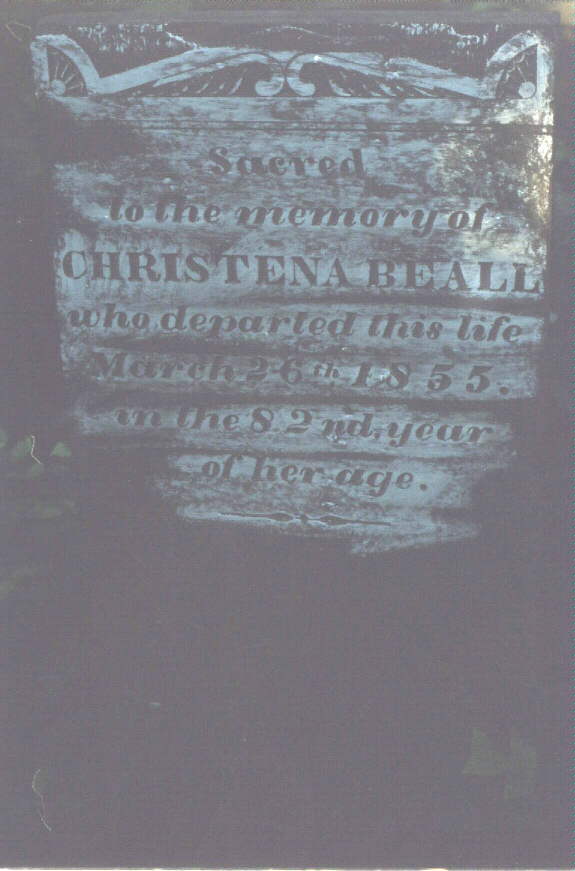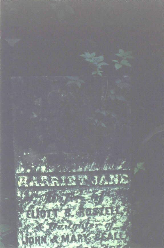 This is a small cemetery located in Ripley County, Indiana in what is called Elrod. The only way I know to get to it is located on private property which I have access to. You have to walk down a field, cross a creek and go up a big hill. There used to be a log cabin here too, but I don't know where. There are Revolutionary War veterans buried here. All tombstones are read from left to right. There are many gravestones of creekrock which are obviously impossible to read, don't even know if there was ever any kind of inscription on them. More are gone or covered over with earth, as there are several sinkholes the proper size for a burial. Row 1 James Grimes/Pvt Houston's Co./Harrison's VA Regt/Rev. War/1840[Headstone] Joseph McDonald/Pvt Clarke's Co./1st N.C. Regt/Rev. War/1840[Headstone] Edward Pendergast/Pvt Post Lethwaite's Co./Wilson's PA Troops/Rev. War/1843[Headstone] Row 2 Sarah A./daughter of J.W. & N.J. Lipperd/Died/July 4, 1857/aged 2 yrs 10 mos 28 days[Headstone] Row 3 Elizabeth P./daughter of ??? (couldn't read the rest) [Headstone] Row 4 3 creek rock tombstones (these may go with the tombstones in row 1 as they are close by) Row5 rock tombstone, white tombstone base, rock tombstone Row 6 Daniel B. Thomason/Died/July 19,1819/Aged 53 years In memory of/James Beall/died/July 16, 1816/61 years of age[Headstone] Sacred to the memory of/Christena Beall/who departed this life/ March 26th, 1855/in the 82nd year of her age.[Headstone] Ninian Beall/Pvt Jones' Co./3 Continental Dragoons/Rev.War/June 13,1836 [Headstone] In memory of/Ninian Beall/who departed this life/June 13, 1836 (1896)/aged 75 years & 10 days[Headstone] James N./son of E.B. & S. Boszell/Died/Aug. 31st, 1851/aged 1 year & 1 month[Headstone] In memory of/Mary M/daughter of/EB & HJ Boszell/died/July 31,1851/aged 9 mos, 19 days In memory of/Harriet Jane/wife of/Elliot B. Boszell/daughter of John & Mary Beall/Died/Nov.30,1850/ Aged 20 yrs 10mos 1 days (possibly 11 days) [Headstone] 2 creek rock tombstones Row 7 Small square stone-MMB Mary A/dau. of ??? 2 creek rock tombstones C.R. (small headstone) N.B. (Small Headstone) 2 creek rock tombstones Row 8 Creek rock tombstone Row 9 James W./son of JW & NJ/died/Mar. 7, 1850/aged ??? (stone is broken off here)[Headstone] Wm. Lipperd/Pvt. Woods Co/Dudley's S.C. Regt/Rev. War/ May 5, 1834 [Headstone] Alvenia/dau. of L.&N. Wickard/died/Jan.23,1819/1 yr and 9 days[Headstone] Real nice stone with German writing-tried to make out the best I could. A(n or u)galta W.C./J.G. u.(or something) C. Mullen/27 Sept. 1844/16 Sept 1859 [Headstone] Row 10 sinkhole Large Obelisk tombstone: Mary/wife of/D.E. Garrington/died/Jan. 15, 1819/aged 25 yrs/(1 or 11) mos. 6 days[Headstone] Broken tombstone: Mary/daughter of??/died/Aug 29, 1802 Row 11 4 creek stones, 3 sinkholes Row 12 4 creek stones Row 13 (may actually be row 14 or 15, but there's not any stones left, this is all the way back by the rear fenceline. 2 creek stones, 1 large headstone, mostly covered with earth, could not un-earth, too many fire-ants. Found some more in heavy brush: stone H.J.B. Partial Stone: March 8, 18??/61 yrs,3 mos, 20 days Read 4/16/2000 |