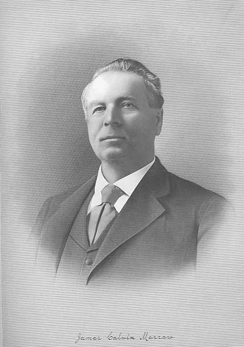 James Calvin Morrow was born on his father's farm near the town of Washington, Guernsey county, Ohio, April 3, 1846, a son of William and Elizabeth (Roberts) Morrow. His ancestors, paternal and maternal, were among the early settlers of America, and numbered among them are men who achieved distinction in the frontier life of those early days, in the French and Indian wars, the War of the Revolution, and in the commercial era which followed. His father, William Morrow, was a native of Washington county, Pennsylvania, born in 1807, who became a pioneer settler of Guernsey county, Ohio, later removed to Olney, Ill., and in 1865 settled at Afton, Iowa, where he died on April 1, 1889. He was a farmer, as were most of his forebears, and during his early life underwent the hardships and privations incident to the pioneer of his day. He married, when a young man, Elizabeth Roberts, born in Pennsylvania in 1807, who died in Afton; Iowa, February 5, 1892. Both he and his wife were members of the Presbyterian church and active workers in the cause of Christianity. To this union were born eight children: R. F., of San Francisco, Cal.; Martha J. Bragg, deceased; Mary E. Lorimer, deceased; Esther Laughlin, deceased; Dorcus W. Hawkins, of Olney Ill.; William B., deceased; James Calvin, the subject of this article, and Wilson W. Morrow.